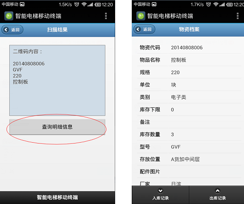使用手機終端中的配件查詢(xún),掃描二維碼信息就可以查詢(xún)到當前的配件的物資編號,名稱(chēng),型號規格,庫存,存放位置,采購記錄,出庫記錄……