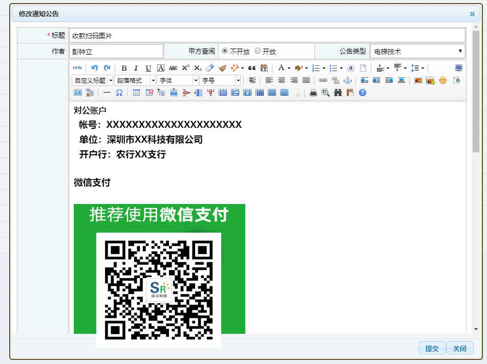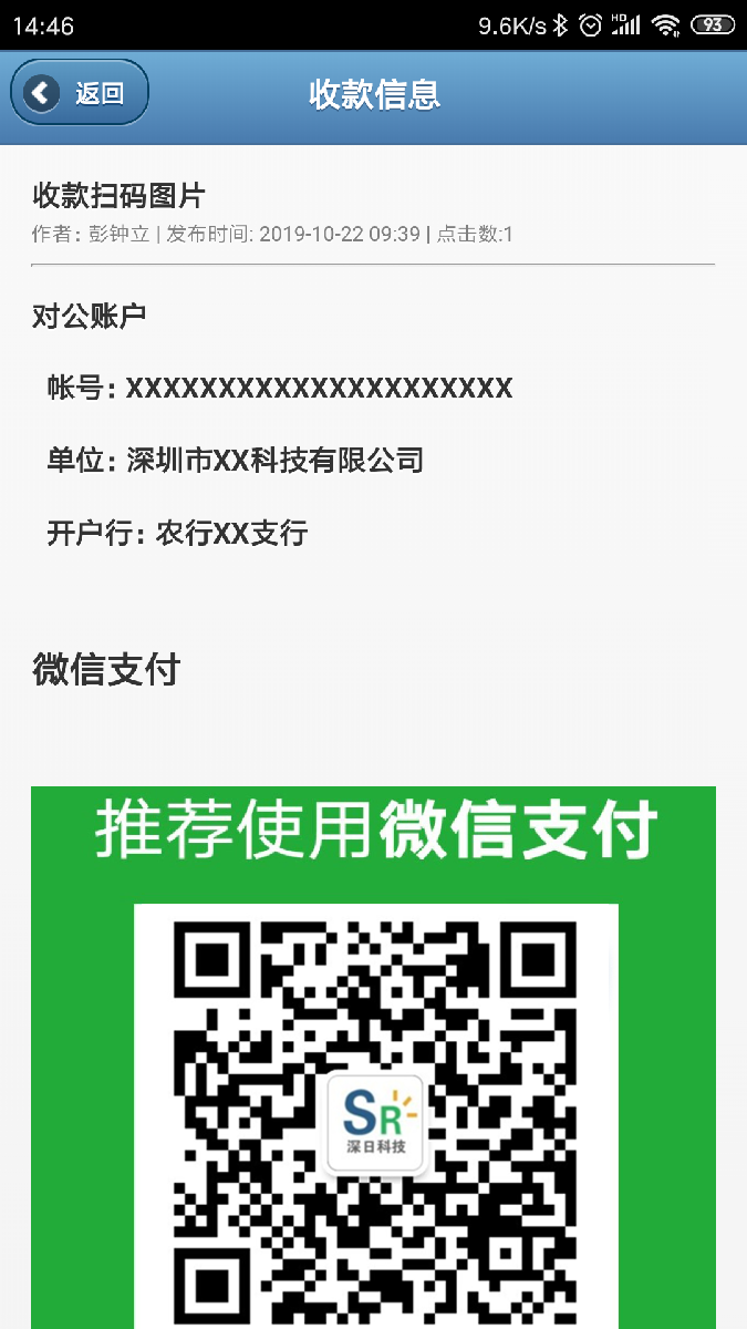可配置手機端首頁(yè)快捷方式打開(kāi)的一份【通知公告】,可用于展示公司的一些固定信息,如收款二維碼等